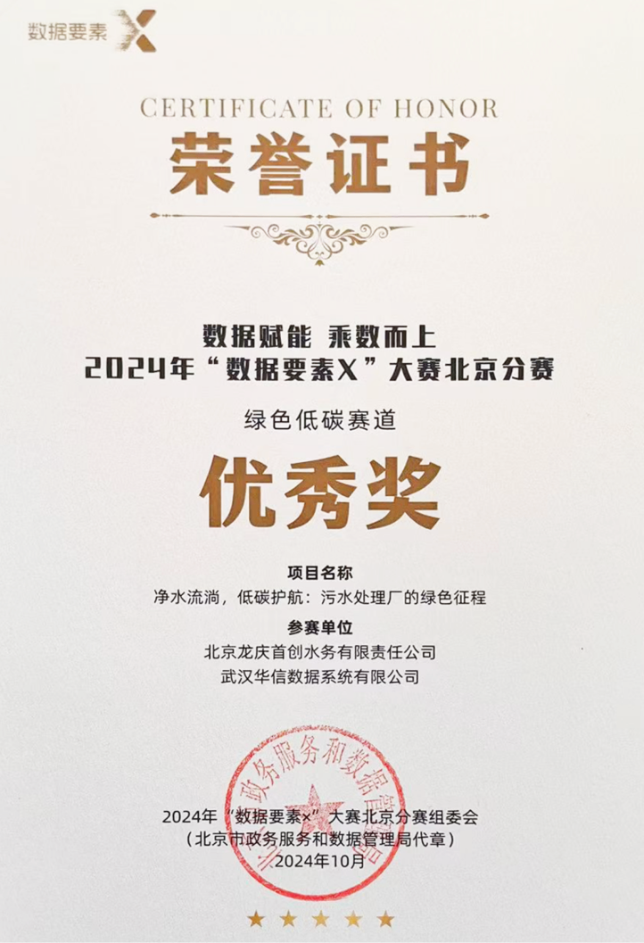 大赛北京分赛区是全国20个赛区中最重要的赛区,奖项评审由6位院士领衔的专家团队完成。武汉九五至尊官网 九五数据系统有限公司与北京龙庆首创水务有限责任公司合作的项目,凭借其在污水处理领域的创新性应用以及对数据要素的有效利用,赢得了评委的高度认可。